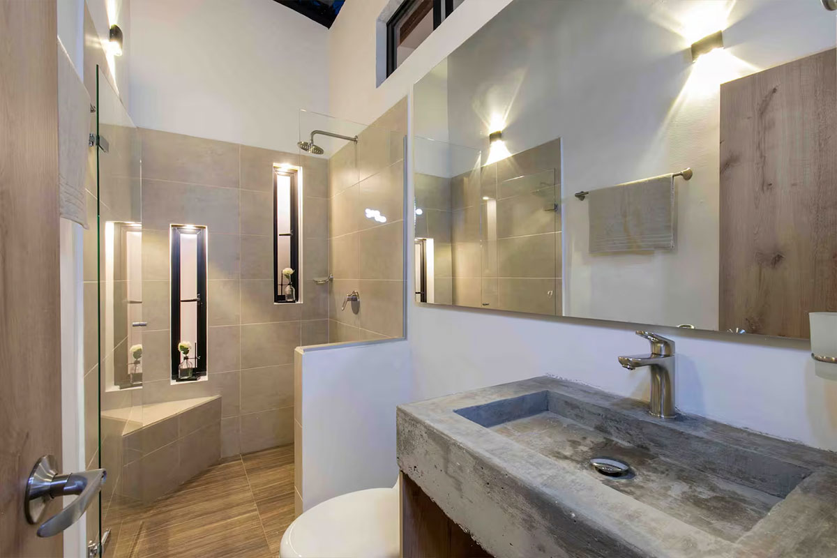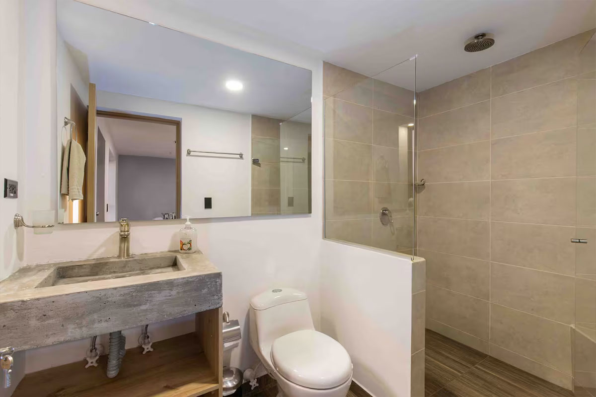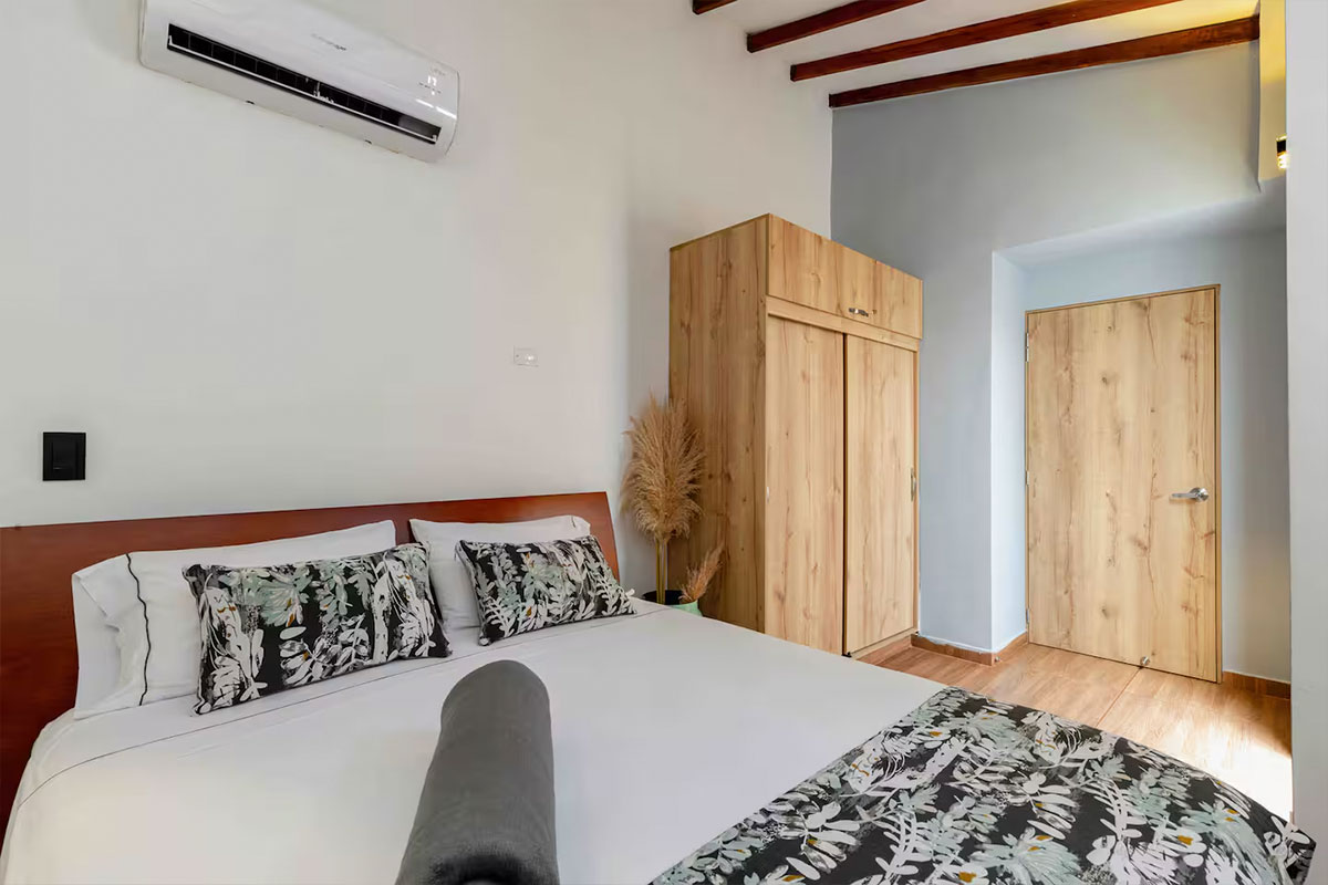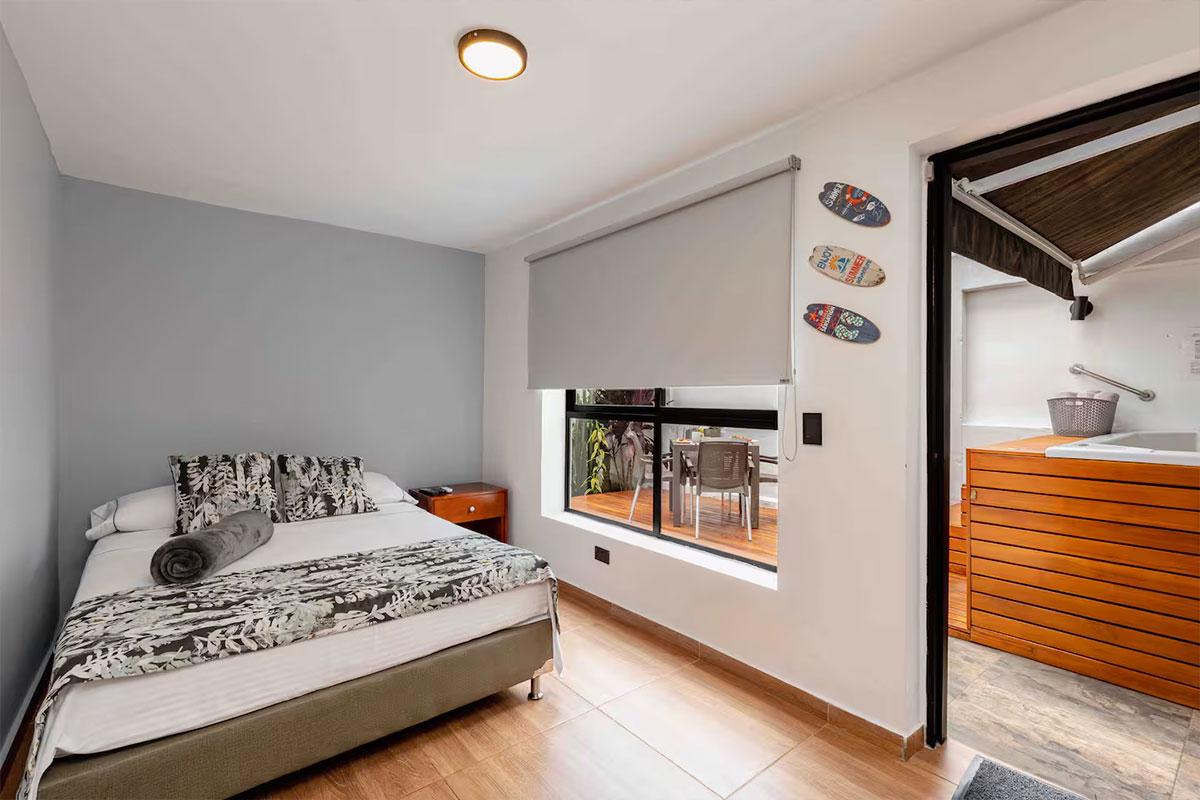 - Una habitación con cama queen size, cama doble, baño privado y aire acondicionado.