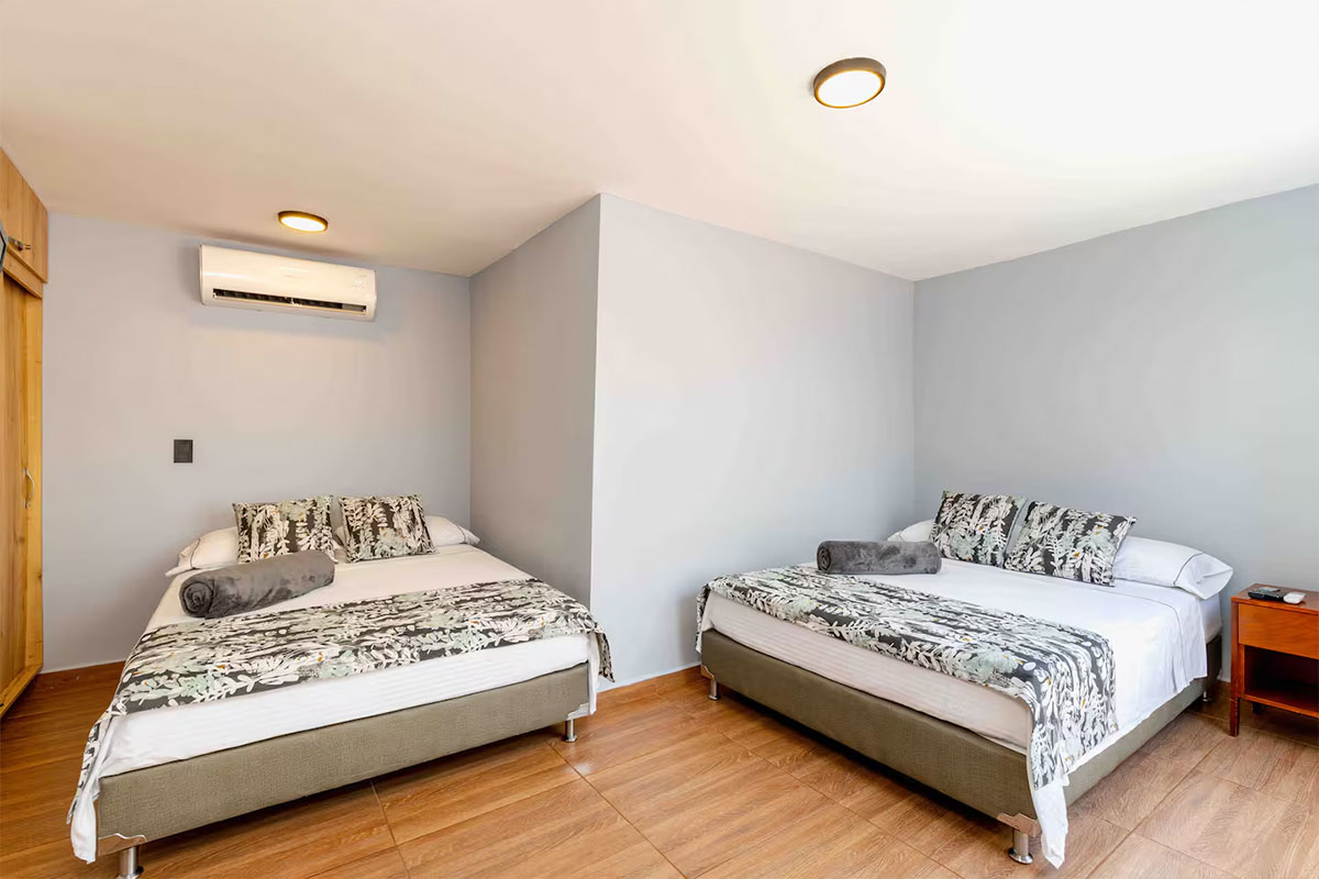 - Una habitación con dos camas dobles, baño privado y aire acondicionado.